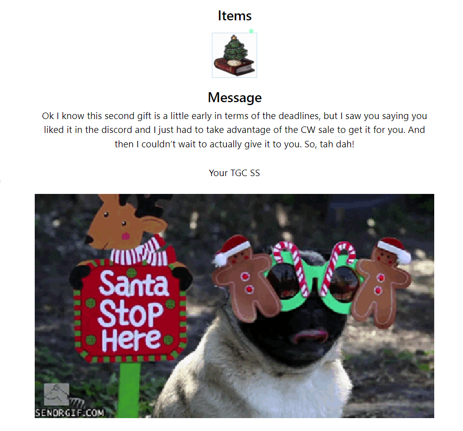 hiii secret santa, thank you sm!! :) wheeee i got a tome! :D and i love the bg, tysm! tea is my fav <3 & hehe i love the pun! def starting to feel festive at least! :')