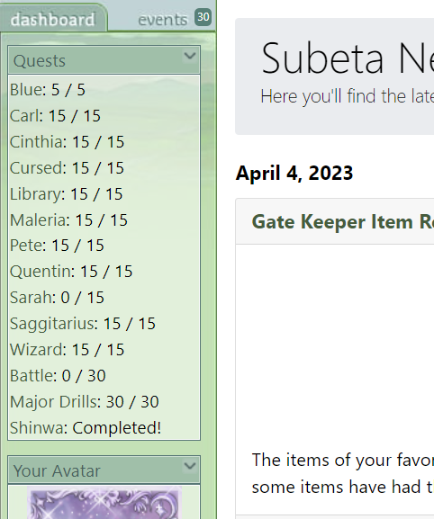 April 4th Dailies done: rift, bathhouse pools, random, ruffie raffle, mallarchy pond Quests: Blue: 0 / 5 Carl: 15 / 15 Cinthia: 15 / 15 Cursed: 15 / 15 Library: 15 / 15 Maleria: 15 / 15 Pete: 15 / 15 Quentin: 15 / 15 Sarah: 0 / 15 Saggitarius: 15 / 15 Wizard: 15 / 15 Battle: 0 / 30 Major Drills: 30 / 30 Shinwa: Completed!