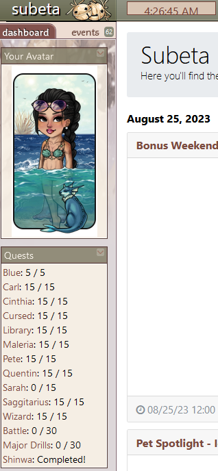 Quests Blue: 5 / 5 Carl: 0 / 15 Cinthia: 15 / 15 Cursed: 0 / 15 Library: 15 / 15 Maleria: 0 / 15 Pete: 15 / 15 Quentin: 15 / 15 Sarah: 15 / 15 Saggitarius: 15 / 15 Wizard: 15 / 15