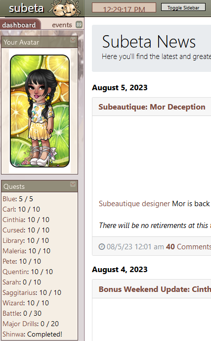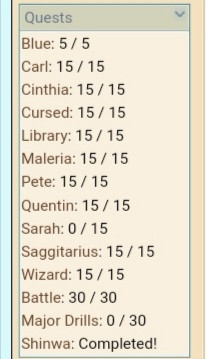 Quests Blue: 5 / 5 Carl: 0 / 15 Cinthia: 15 / 15 Cursed: 7 / 15 Library: 15 / 15 Maleria: 0 / 15 Pete: 15 / 15 Quentin: 15 / 15 Sarah: 15 / 15 Saggitarius: 15 / 15 Wizard: 15 / 15