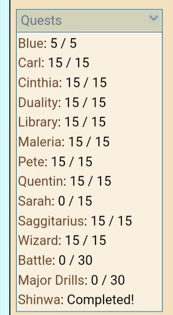 Blue: 5 / 5 Carl: 15 / 15 Cinthia: 15 / 15 Duality: 15 / 15 Library: 15 / 15 Maleria: 15 / 15 Pete: 15 / 15 Quentin: 15 / 15 Sarah: 0 / 15 Saggitarius: 15 / 15 Wizard: 15 / 15