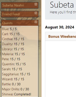 Quests Blue: 0 / 5 Carl: 0 / 15 Cinthia: 15 / 15 Duality: 0 / 15 Library: 15 / 15 Maleria: 15 / 15 Pete: 15 / 15 Quentin: 15 / 15 Sarah: 15 / 15 Saggitarius: 0 / 15 Wizard: 15 / 15 Battle: 30 / 30