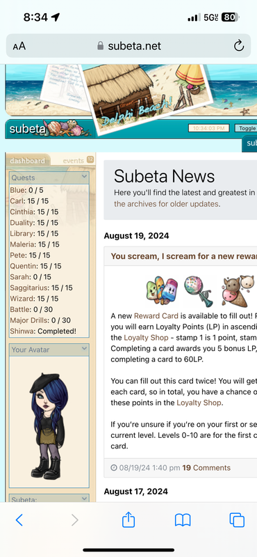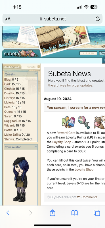 Quests Blue: 5 / 5 Carl: 15 / 15 Cinthia: 15 / 15 Duality: 0 / 15 Library: 15 / 15 Maleria: 0 / 15 Pete: 15 / 15 Quentin: 15 / 15 Sarah: 15 / 15 Saggitarius: 15 / 15 Wizard: 15 / 15 Battle: 30 / 30