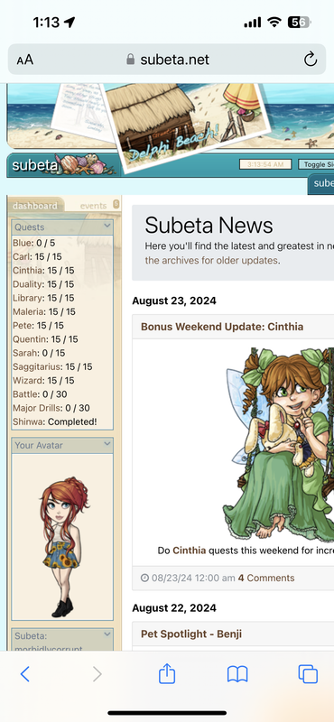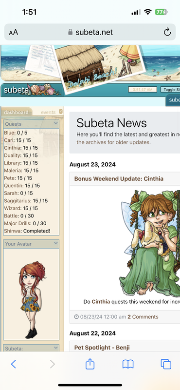 Quests Blue: 5 / 5 Carl: 0 / 15 Cinthia: 15 / 15 Duality: 15 / 15 Library: 15 / 15 Maleria: 0 / 15 Pete: 15 / 15 Quentin: 15 / 15 Sarah: 15 / 15 Saggitarius: 15 / 15 Wizard: 15 / 15 Battle: 30 / 30