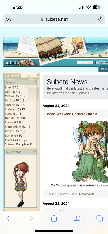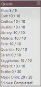 Quests Blue: 5 / 5 Carl: 15 / 15 Cinthia: 15 / 15 Duality: 15 / 15 Library: 15 / 15 Maleria: 15 / 15 Pete: 15 / 15 Quentin: 15 / 15 Sarah: 15 / 15 Saggitarius: 15 / 15 Wizard: 15 / 15 Battle: 30 / 30