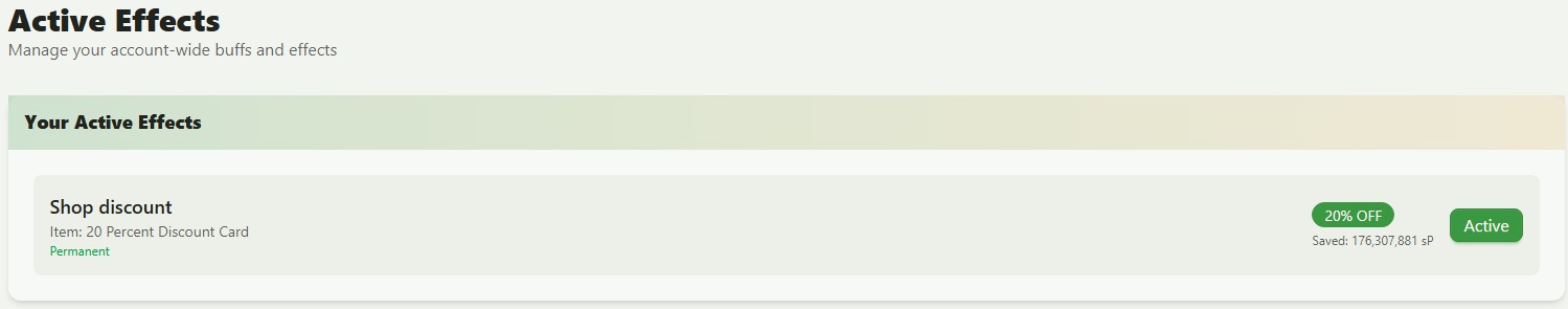 I have a 30% discount card on the main site, but it doesn't show up in that box you have under "Main Site" above. The only card that shows up there is the 15% discount card you get randomly while restocking in the main shops. Maybe that's the buff that just showed up for you? If you hover over that pink icon, it should say "15% off in the NPC Shops!" That is separate from the discount card that you own. If you turned your card into Kumos, then that discount will not be applied to the main site any longer, from what was previously posted by .