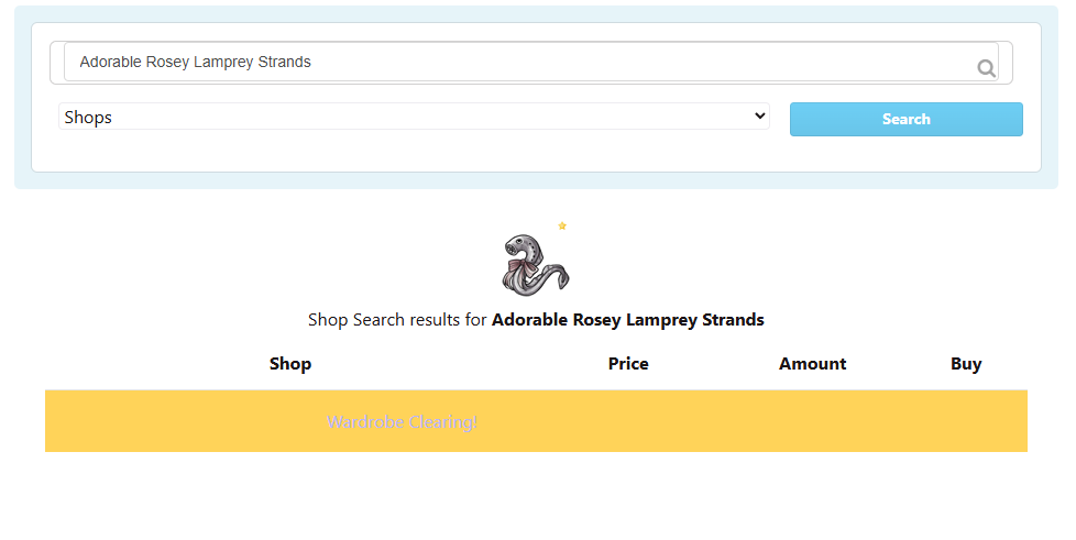 Her shop is Here Take the very first item in her shop the Adorable Rosey Lamprey Strands If you put Adorable Rosey Lamprey Strands in the site shop search nothing shows yet there is clearly one in a users shop for sale. I am not sure if it is an issue of not showing the rarity 200 of cw's or if the shop search now doesn't show items that are priced for CSC.