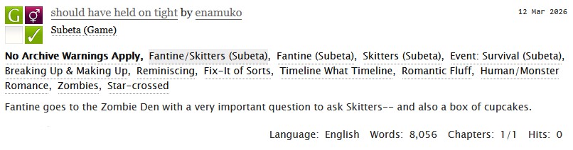 I wrote a Subeta-fanfic of my favourite Survival related couple for the holiday! no they did not break up except for the sake of me writing this fic what are you talking about Comments even from those unfamiliar with ao3 are welcome but they are moderated (meaning I need to approve them to be posted) because I have frequent run-ins with trolls, spammers, etc on that site :) Please let me know what you think!