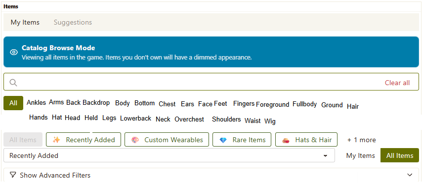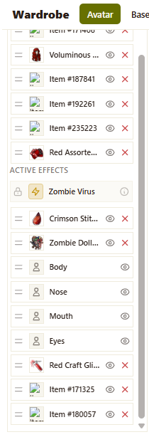 that means in order to actually add items, i have to scroll ALL the way down, removing my HA from view; thus i have no way of previewing what a given item actually looks like as a wearable, let alone what it will look like on my current HA. i know i've been playing a long time but i don't have all the wearables memorized like that! then i have to scroll ALL the way back up to see what the items look like on my HA and make adjustments to their position in the list.