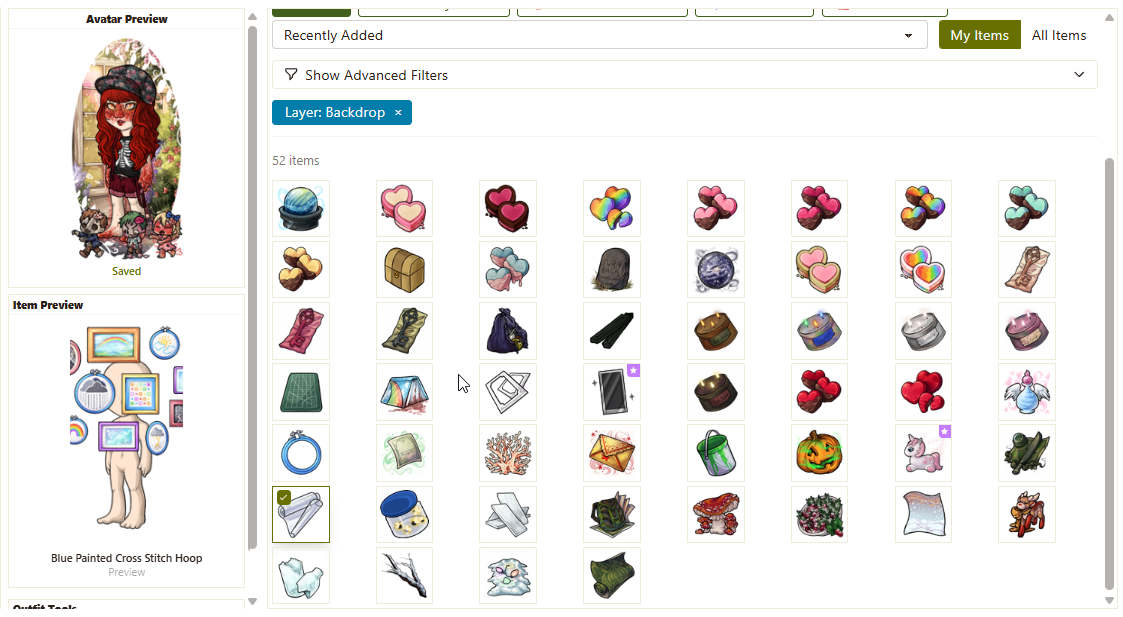 additionally the horizontal spacing between wardrobe items leaves big weird gaps. i think grids should be grids, with equal vertical and horizontal spacing between elements, so it takes the same amount of movement to reach something to the left or right as it does to reach something above or below the item you're currently hovering over. anything else is uncomfortable to use and look at.