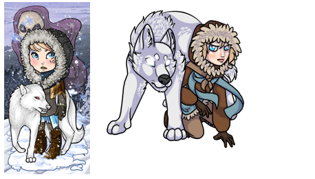 Request Type: Chibi (I really love this example) References: HA + overlay Other Notes: She's a child, if that matters for your chibi style. XD The wolf need not be included, however I'm willing to pay more if you do include him. He's big and white with white eyes. Pim is very determined and pretty adventurous. Despite being only eleven, she's both a loud mouth and a hard head. Total/Offer: 6mil (possibly more for adding the wolf. Let me know about that. XD)