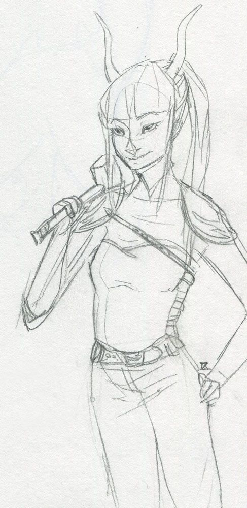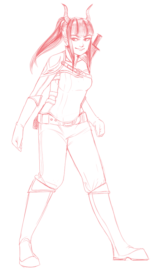 Could you possibly draw Ifret for me please? The shirt is long sleeved and the bottom half of her outfit is like this (ignore the top here and the sword and gloves.) Her belt is brown with a silver buckle, black pants, brown shoes that are steel-toed. She's a weapon maker so you could include her hammer if you'd like. Personality wise she's confident, intelligent, sly, and can talk herself out of anything.