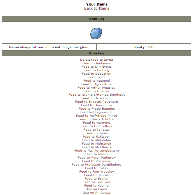I'm assuming this is a bug, as usually the delete link for an item would be on a line of its own, and separated by a line break before you get the other options.... isn't it? Not only is having it on the same line really confusing, but it makes mis-clicks even easier! I guess it's for the eggs awarded for battles, because they don't have any vault / shop options, and of course you can't donate / give it to a buddy.