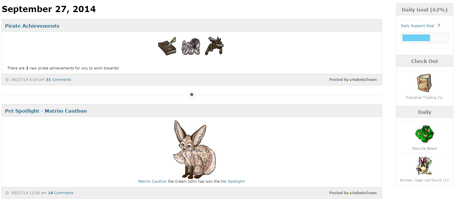 Problem 2: Only four potions have been given out for... at least a year now? Glade Potion Common Potion Glacier Potion Blacklight Potion These are the only potions that have been won for a VERY long time. If this could get fixed that would be pretty fantastic. Again, I haven't taken the time to get proof, but if you'd like I'll take a screen shot daily and in a month's time it should be enough evidence. Unless there is some place in the coding that keeps any information about the previous winners that would help? Problem probably fixed! [edit] Now we get a third problem! This is like Christmas! Problem 3: The image of the potion no longer shows up in the news posts, but you can still figure it out by looking at the image URL Problem fixed! [edit] To finally start keeping track of the potions won since the start of this thread.