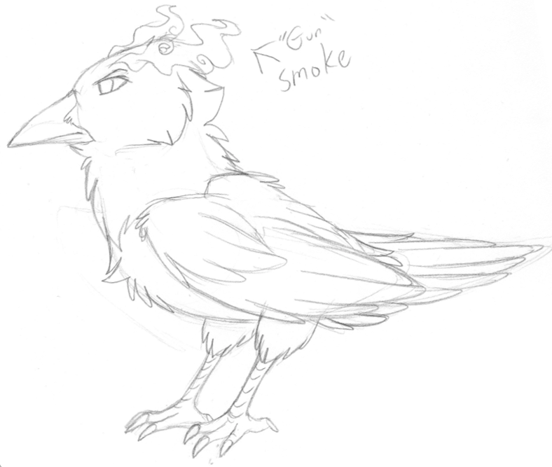What/Who you want drawn: Pistol the Nightmare Lain Written Description: Gun smoke appears on the top of his head and on his wings when he's in flight. His beak is more narrow and sharp rather than the wide beaks of normal lains Visual Reference(s): not too much of a visual reference but here is a sketch. other than that you'll be the first to draw him! Method of payment: csc Commission type: full body