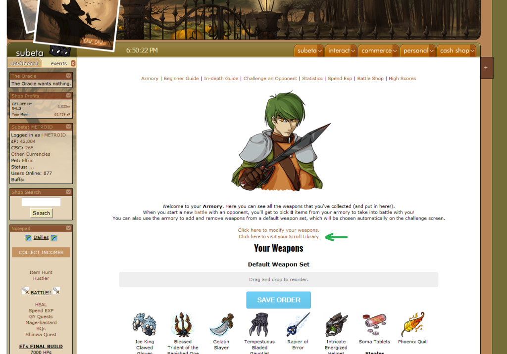 The whole point is that we should be able to assign each pet a default weapon set, so that on the BC "challenge an opponent" page, when you click the "battle with default weapons" button, it automatically recognizes the set for the selected pet. It's the same idea for a scroll library. Add the scrolls to the library like how we add weapons to the armory, and then equip them to each pet that way, and save a default set for each. Then when you start a battle, each pet will have a set of weapons and scrolls already waiting for it, with no hassle. And no error messages that make me sad.