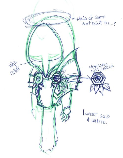 Changes: Reverse colours, make circular parts hexagons, put a collar inside the hood to help hide face, toss a halo on there