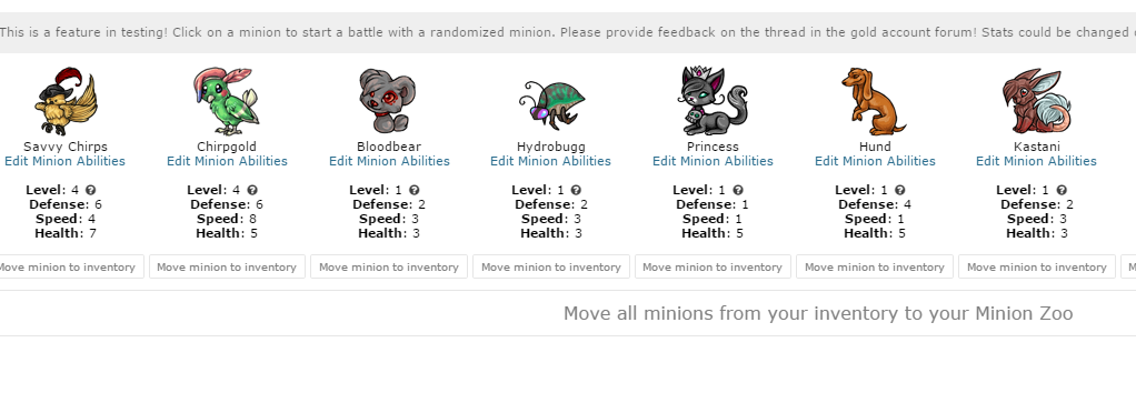 Maybe for battling minions we can do ability trees? Like choose to make them more defensive, or magic inclined, or however we choose per minion? The click this and that stuff is too easy. Or maybe implement a battles per day option? It needs something either limiting or goal aimed to keep interest. I mean it's not like we get to rapid train our battling pets in this way, they end up limited in their growth rate at some point.