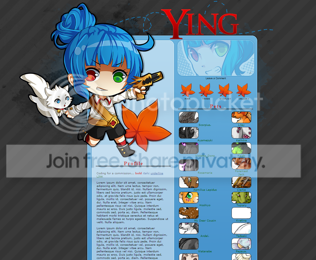 Hey I'm back again! :) I have a question though--can you fix up profiles that are done by someone else that's no longer on the site? I have a pet Fianetta and I was wondering if there's a way to not have to click on the phoenix to bring up the pet part box? Also to have her name somewhere in the box rather then on the far left side? I like everything else (unless you believe the background could be spruced up a bit). I want both of you to be included for credit of the profile and I can pay either as a new profile or an update. Whichever works I'm fine with. :) If this is something that's workable I can smail you the code that she gave me. Or if you want to change/move stuff around I'm good with that too. :)