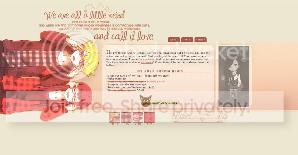 [edit] User Profile User Name: Nayona Image(s): art (artist is sonatine) Colors and styles preferred: Anything that you think really brings out the beauty of the art? I don't even know what I want lol dude....I'll just give you artistic freedom? maybe something similar to THIS? as far as color? Something light, with maybe that same type of line through it? in black or another color? just for the background? Text: username? or a quote having to do with traveling? delivering letters? Number of columns: Static scroll Hover/Drop down: drop down comment section? Extra Info: Something EXTREMELY close to THIS setup? So with the tabs up at the top so I/anyone can click on the different sections (About/pets/extra) as well as the small icons on the bottom (Home/mail/wish/shop) and the drop down comment section?? art to sit similar to this over the black line/stripe/rectangle or whatever color line/design