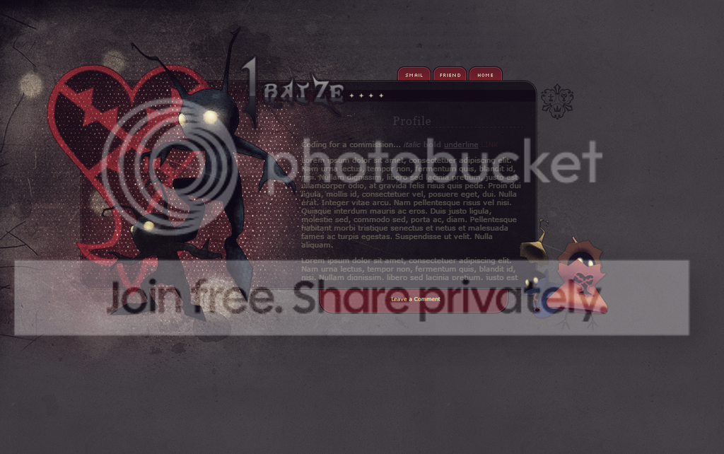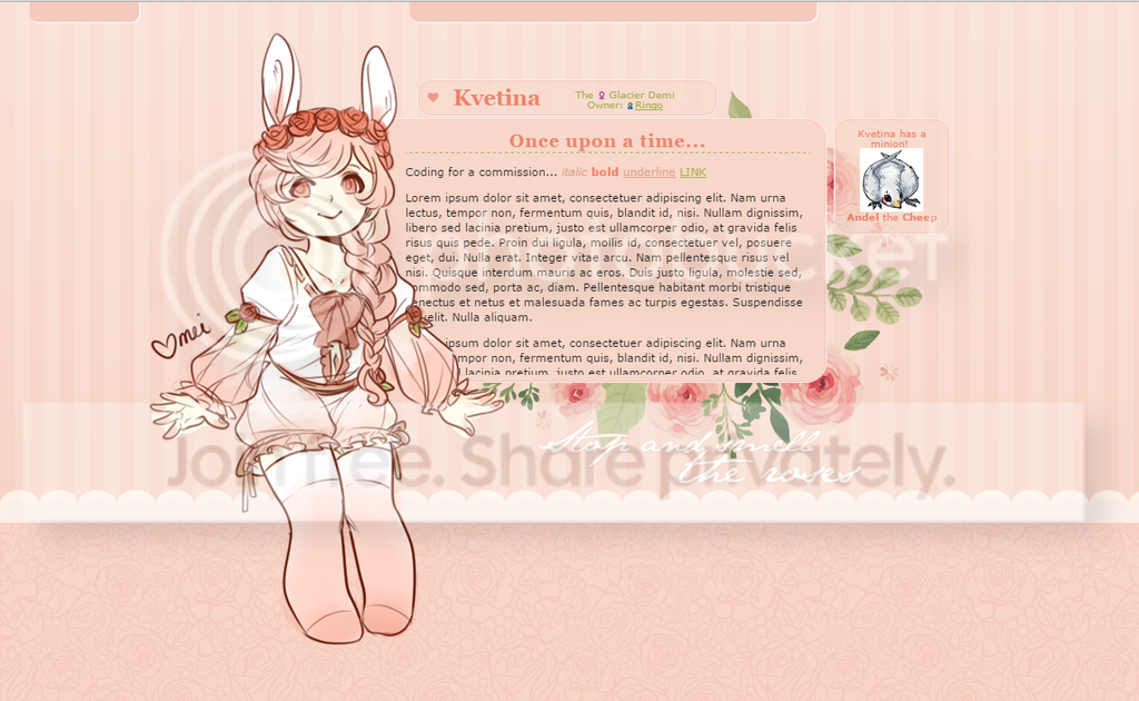 User Name: Jane. Pet Name: Gisella. Image(s): Profile artwork by . Colors and styles preferred: Some tones similar to this. As a direct contrast from Brook, which you commissioned for me last, her profile is more feminine and soft. Text: Just her name, Gisella. I'm hoping for a font similar to this. Continuous scroll or static scroll: Static scroll. Extra scrolling areas, hover, or anything else: Hover to hide her Treasure Chest and the Pet Spotlight. Any areas removed?: No stats, friends, or minion. Other: I would like the mood of this profile to delicate and feminine. Soft textures and brushes. Her story has to do with finding her own beauty as a moth in a world of (snobby) butterflies. Extra Info: For my pet profiles, I always have certain consistencies that they each share. These include: a horizontal, layered layout; reduce-sized Treasure Chest items with opacities; a scroll bar cover; the pet owner listed as "a character by Jane"; the pet name in a special font; the credits for artwork and the profile placed on the background; and pull-out tabs for the Spotlight and Treasure Chest. I was hoping to have these little details in this profile as well. c: