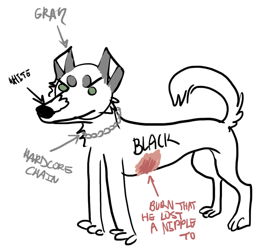 Character Reference: The first character is a siberian husky; I don't have a sheet for him or anything but he should be thin/lean looking with a thinner, more summery coat like this dog. His colors/markings look like this. He has a burn on his side/chest like so, along with "cropped" sort of ears, which are more just cut off along the tops than a typical crop. May wear a chain but if you don't want to include it you don't have to. Preferred Pose/Angle: I'll leave that up to you tbh, as long as it's overall confident looking then it's fine. Whether or not you want to draw the side with the burn is on you, I'm not picky about its inclusion. Expression: Similar to this. Or whatever really, as long as it makes him look like a jerk. Any Extra Details: He is a weredog and also a psychopath. That being said, I don't want him to look crazy or anything, just like a total jerk. Dunno how much that info helps you though lol.