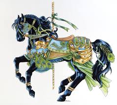 Awesome! I suppose you could do either the whole carousel or just the horse, with the pole sticking out of it. Here is a design I like, but feel free to change it up: Maybe without the peacock motif
