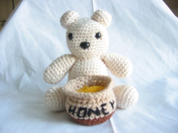 Character Name: for my pet Bear Character Ref: hes never been drawn before, i hope thats ok! i want to get a drawing of a crochet bear like this one (using this pattern, bear sitting up, heart shaped pads), except i want his face to look happy not inquisitive, and i don't want his head tilted. i want the bear’s fur to be chocolate brown and the detailing (inner ears, mouth, paws etc) to be light pink. id like the bear to be holding a crochet honey pot like this one. put one medium sized pink heart on the front of the pot (or a few smaller pink hearts) instead of the word ‘honey'. the color of the honey pot can be whatever you think looks best, maybe tan? Type***: fullbody (i always make sure to mention custom overlay since i might end up submitting the drawing, or it might just end up as profile art!) sP / CSC / USD: usd