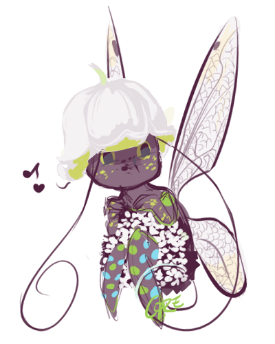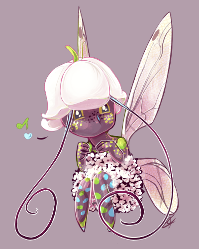 sorry for my lateness, i fell asleep right after dinner! Character Name/Ref: unnamed forest sprite - ref of a generic sprite (not mine) I don't have any refs of my sprite yet, so i will try to explain if that's okay! mine is sort of androgynous-looking but is female - wears a lily of the valley hat, has a human shaped body with black skin and the markings and wings of this dragonfly; if you wish she can be wearing a lily of the valley dress or a dress made out of this flower (basically just a big ball!), or no dress at all and the markings can sort of act as a cover-up if that makes sense. she has body-length or longer antennae! Her feet come to points, not fully formed feet. Also, if you wish, she can be wearing some boots that look like the feet of this fuzzy moth! Personality/Pose Suggestion/Other Info: something mischievous! c: sP / CSC / USD: sP <3