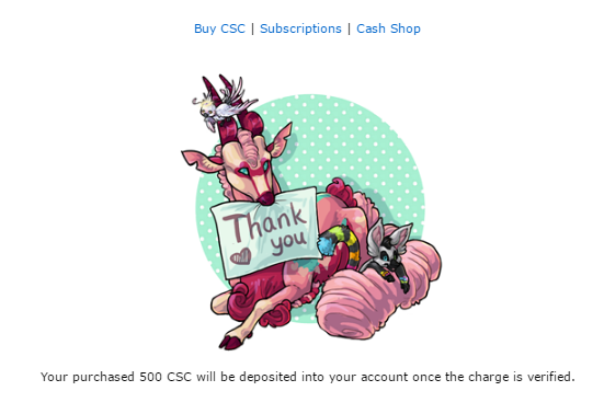 "Your CSC purchase has been processed. Your account has been credited 500 CSC. Make sure to check your reward card!"