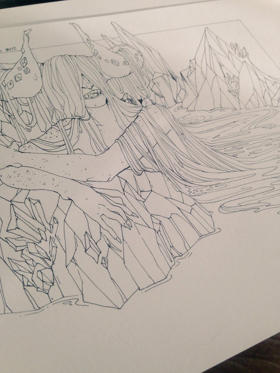 It's not completely in ink, under drawing is ball point pen and overlaid with sakura micron ink pens for the outline inking. the rest is a mixture of conte pencil and graphite pencil on toned tan strathmore sketchbook paper.