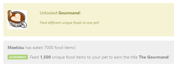 You've earned the Gourmand achievement! (6k) You've earned the Couch Potato achievement! You've earned the Speedy achievement! (2.5k) You've earned the Lots of Health achievement! (2.5k) You've earned the High Level achievement! (1k) You've earned the Taco Tuesday achievement! You've earned the Mass Recycler achievement! (35k)