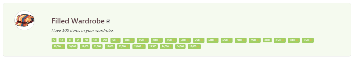 congrats on getting to 5k! The 15k wardrobe achievement does take awhile.