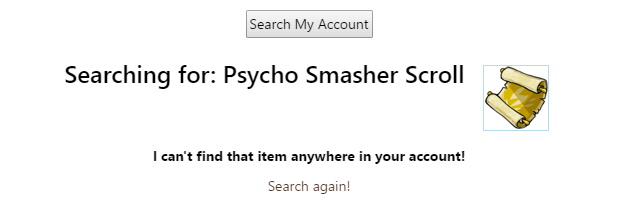 I don't know if this has been suggested before, but our scrolls really should show up in account search. I had no idea they didn't and just wasted 7 mil on a scroll I already had. Lesson learned today, but it only seems logical that scrolls should be included.