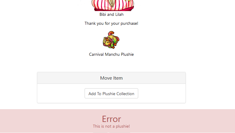 image says it all pretty much. when I clicked on the "add to plushie collection" button it gave me that red error message.