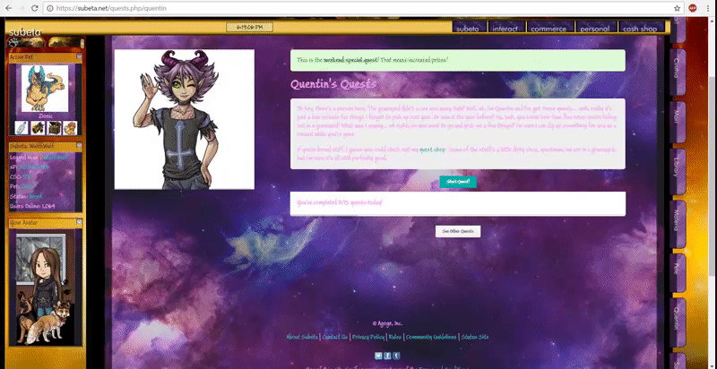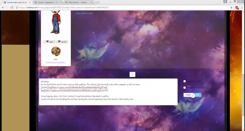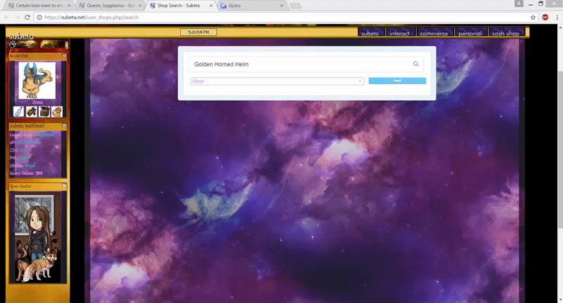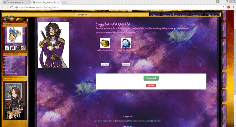 - for what it's worth, this has also been happening to me for quite awhile now. Usually when trying to start a quest or do a shop search. I am on a Windows 7 64 bit laptop fully updated, and running Bitdefender Total Security 2016 also fully updated. I am using Chrome Version 57.0.2987.133 (64-bit) fully up to date with no extensions. It never happens anywhere other than Subeta and I am convinced that it's not a virus or something on my end (other than possibly some sort of strange interaction with Subeta).