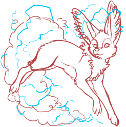 Main body fur: dark gray, similar to what it is currently in her overlay here. Back of ears and legs: darker gray (maybe even black if that looks good?) Cloudy tail: this is the part I don’t think I can do justice lol. I want it to have a purple and blue-galaxy vibe. Here are some inspiration pics; 1, 2, 3. Of course, use your creativity (doesn’t have to follow any of these pics exactly), just to give you an idea. Feel free to add shades of like, pink or white if you'd like! Spots: Outlined in the same dark gray/black color used for the legs. The colored center of the spots would be a purplish-blue color. Something that pops against the dark gray color of the body. Inside of ears, stomach/chest, “eyebrows” (?): same purplish-blue color used in the inner spots Lightning strikes: an electric blue Eyes: bright blue Nose: umm, not sure about this one? I’ll let you decide :) Rain is not necessary