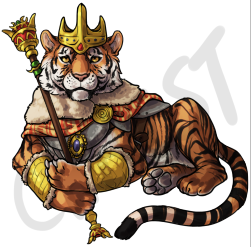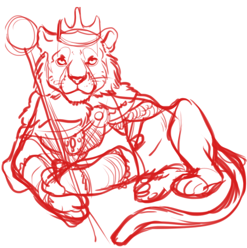 Was definitely wanting to keep the crown, and the cloak, if possible, (maybe partially underneath him so it doesn't hide his body?) as well as the amulet from this reference. I'd also like him to have some armor pieces, (maybe on his forelegs, chest, and back?) and some of the items on his belt if possible, but am not picky on the details, so feel free to alter as necessary.