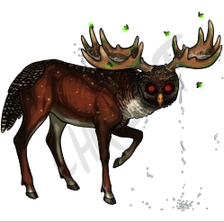 SUBJECT REF: How do you feel about a bit of Frankenstein-ing? I would love if I could get a creature that has the body of a deer, preferably similar to a chital deer with similar coloration as the image except a few shades redder, though with less spots like this one. And with the head of a black banded owl (with the reflective eyes, if possible), but with a pair of (size relative) horns/antlers that vaguely resemble a mooses antlers with a small swarm of fireflies flying above/between them. Big enough to where there can be a small "puddle" in the antlers for the fireflies to make their home, maybe a little moss hanging from the antlers but I may be getting a bit too greedy there. xD As far as a tail goes, I would like to leave that up to your artistic freedom. Whatever you think would look best on the butt of this crazy thing I'm sure I'll love!