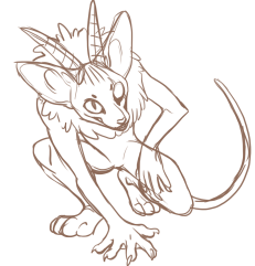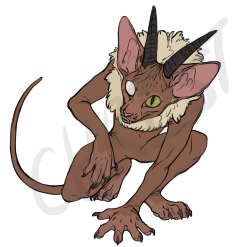 SUBJECT REF: A mischievous anthro chocolate sphynx. With smallish goat horns like this. And if possible, wearing something like this item . The left eye is greenish yellow, normal kitty eye. Right eye is all white with a scar down across the eye from above the eyebrow to the cheek.