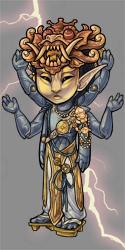 Background/character idea: His names is Indra (इन्द्र), based on the indian thunder god. He is a elder pagan God, forgotten at this point of history. At His peak of popularity, in the past, people would feed Him sacrifices in exchange of protection against floods and storms that could ruin the harvest. Now He is forgotten, and to survive he offers wishes and treasures to any human in exchange of a sacrifice. This is the form that he shows up to humans, as a god he doesn't have a physical form: art and HA representation