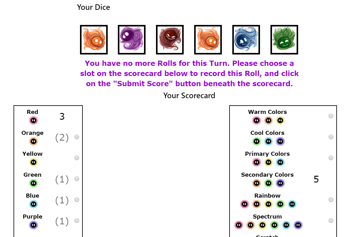 As you can see, I have blue, green, and purple dice showing. That should mean that "Cool Colors" would give me points, right? So... why isn't it offering points for that combination?