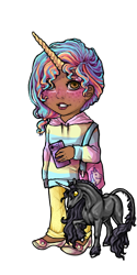 I agree with Fizbee on all fronts - this is such a cute and peppy design for a cute and peppy song. I can imagine a music video for it starring your models perfectly. My one complaint is I feel like the colours don't match on all fronts -- KIRIN's pre-transformation look, as well as the queen, have different colour palettes from the rest of the designs, and in my opinion Paz's makeup is too dark for their outfit. However overall the designs mesh well enough to create a cohesive story, and what a story it is.