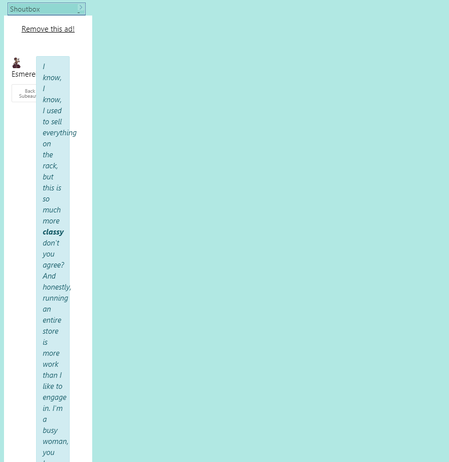 [Url=https://imgur.com/a/DTv6Ged]took a couple of screenshots to visually explain[/url] https://imgur.com/a/DTv6Ged So I'm using my phone for subeta access as I'm currently on holiday, and last night all of a sudden the whole site has been squished into the left sidebar, as you can hopefully see if I linked the right page for the screenshot.