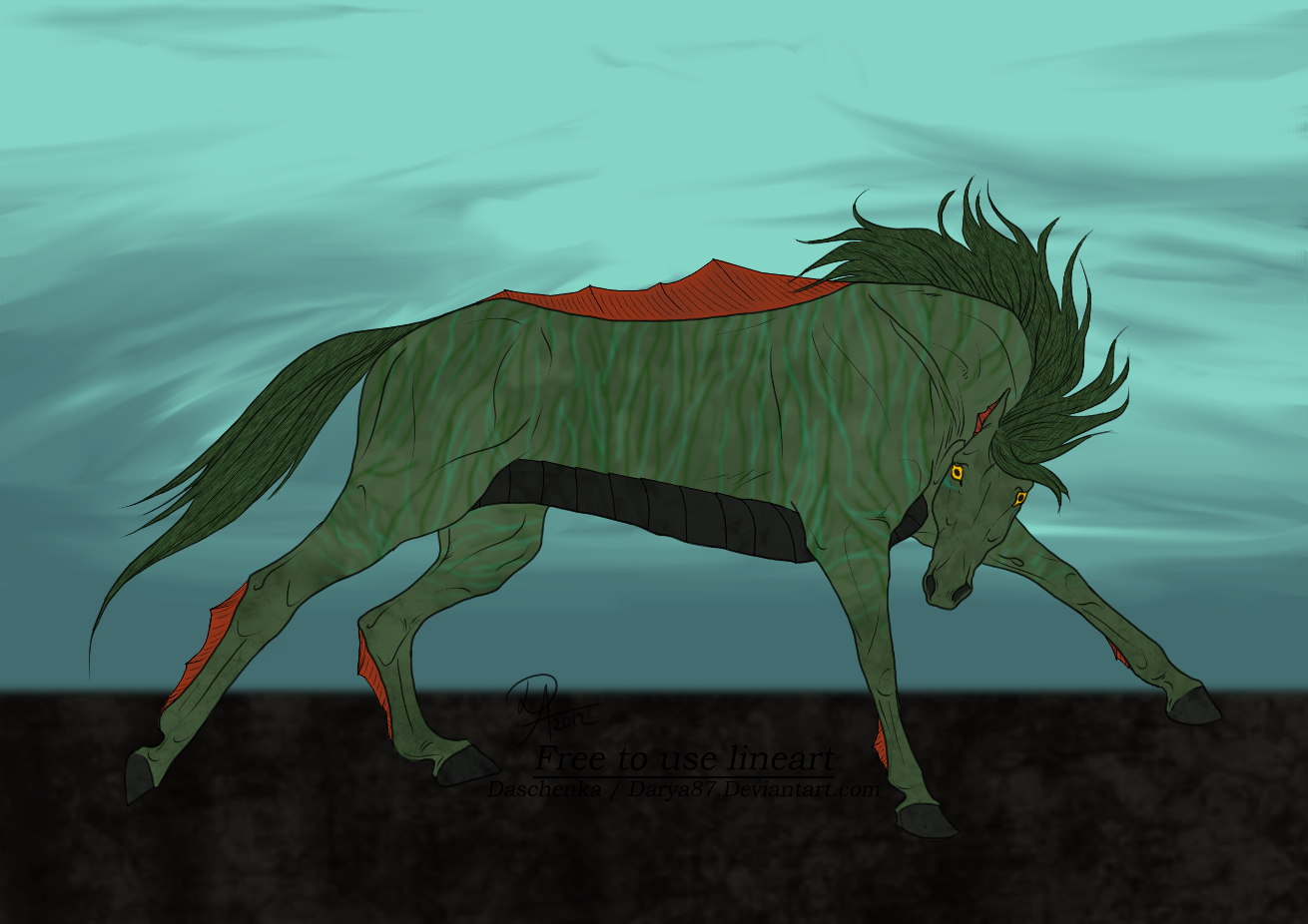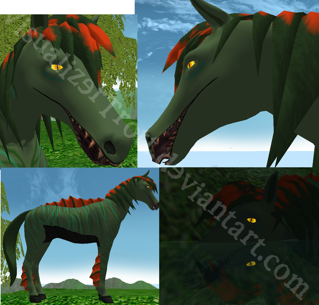 The only discrepancy is that his mane isn't supposed to have the orange in it, it's supposed to be dark green and kinda seaweed-y. The orange was only there because of overlap issues in the model. He's also meant to have long ears with finned edges. His mouth can be open, closed, or slightly open to show off those razor sharp teeth and forked tongue of his. I know you said you want to try new species, but he's not quite a horse, so.. Maybe he'd work? ^^;