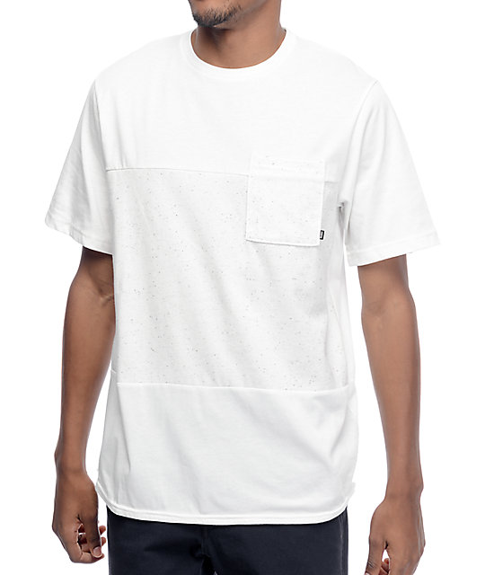 The male version is closer just because there are no boobs to hold anything up or suggest under the fabric. However, this makes the pocket attract more attention. Right now, the pocket looks drawn on. The outline should be made thinner and darker/lighter to suggest an indention where the pocket is sewn into the shirt/casting shadow on the shirt, or is a patch of fabric standing out from the shirt. See below images for references: