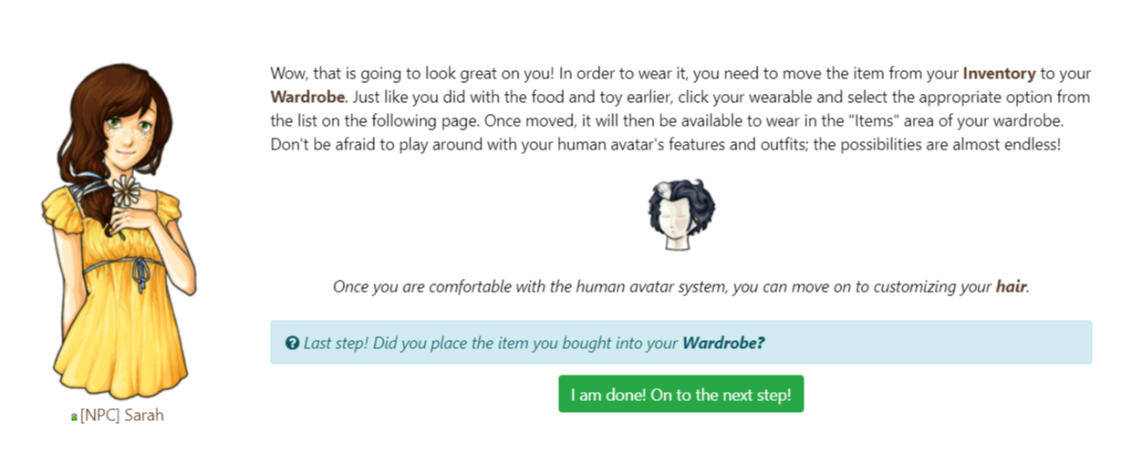 - Item does not show up in inventory in order to move it to the wardrobe, & without the item, you can't complete this step & continue on.