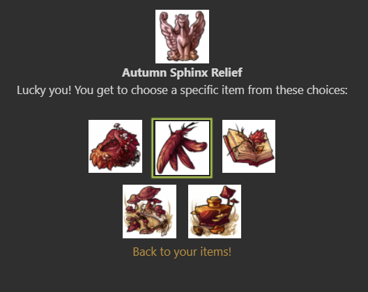 but according to subetaLodge theres an item called [item2=Autumn Sphinx Cuirass] that should be obtainable via opening the sphinx relief. I'd like to nab the item but right now it's not an option, can this be fixed?