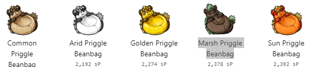 Late reply from me, lol. Looks like the item image is fixed now, but the [item2=marsh priggle beanbag] just didn't receive the art update at first! The older one had thicker lines for the seams on the beanbag, and slightly lighter green prickles. The body is the same medium shade of brown. The faces on the new ones are cuter, hehe, with a smaller mouth. And, I just realized this while trying to describe them, but they really DO look like beanbag chairs!