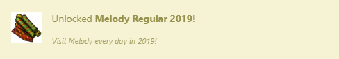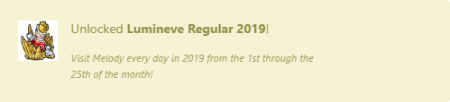 In addition to daily presents, there are two achievements for visiting Melody's Cottage consistently throughout the month; one for going the first 25 days (Lumineve Regular 2019) and another for going all 31 (Melody Regular 2019)! (They are retroactive, but will show as 0 until you visit Melody for the first time since they went live.)December 1